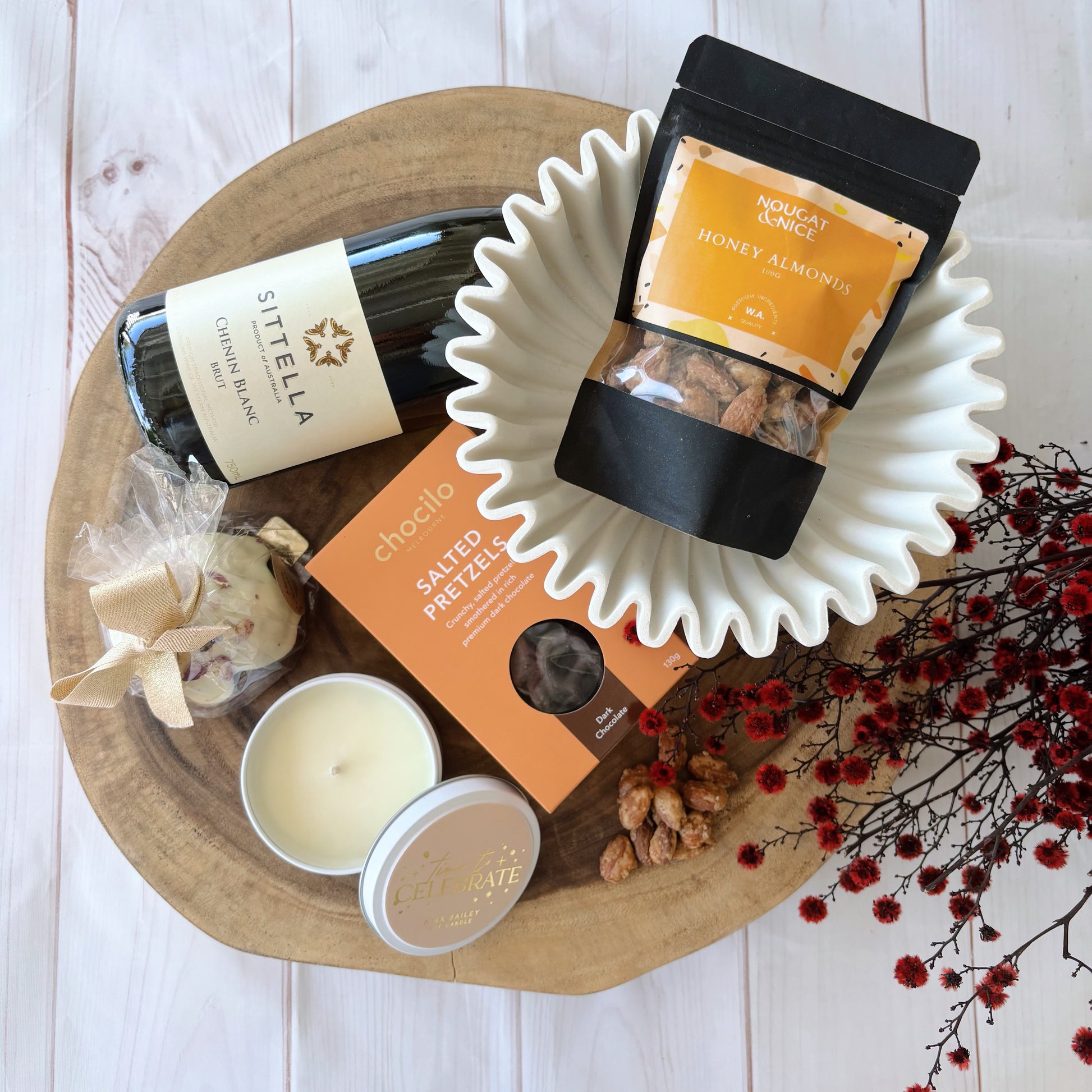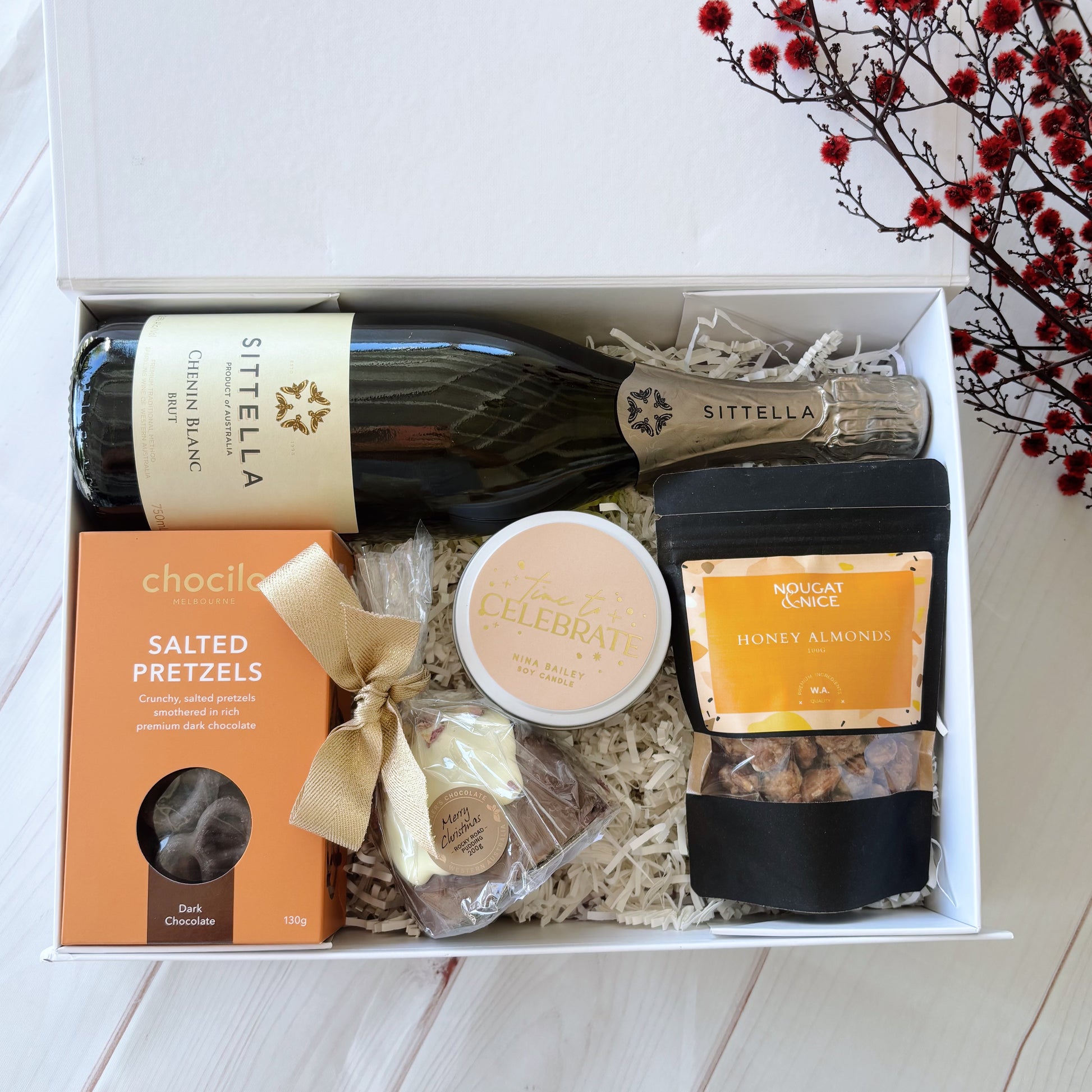 A joyful pairing of sparkling bubbles and Christmas favourites - choc pretzels, honey almonds, rocky road and a warm seasonal candle for a perfectly balanced festive gift