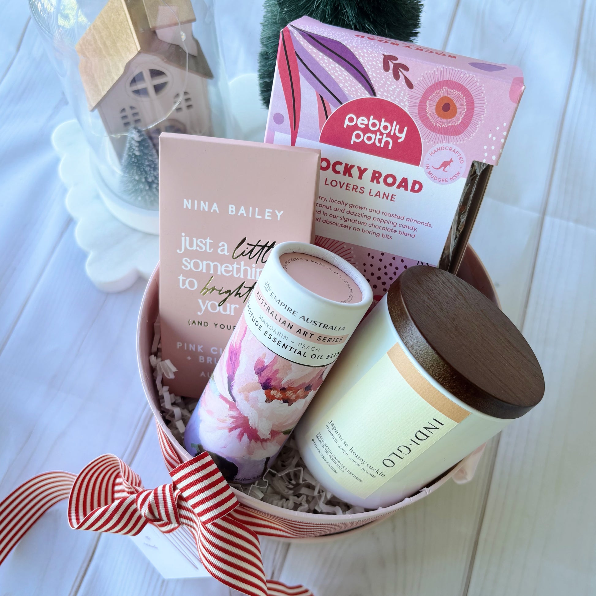 Gift box and card ~ delicately packed in a pink hat box wrapped with festive ribbon and dried floral.