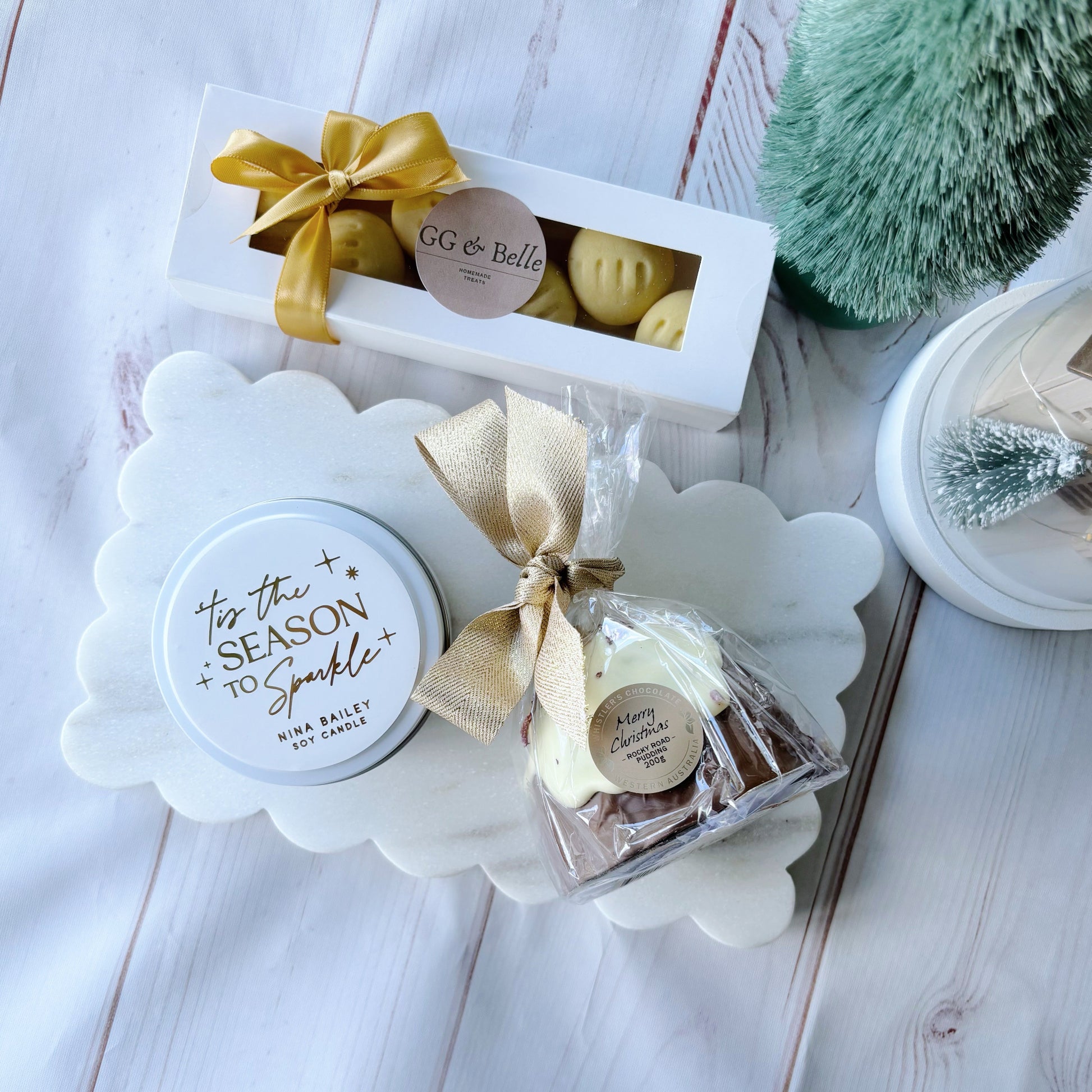 Sweet treats and warm light come together in this cosy holiday hamper. With melting moments, rocky road pudding and a soy candle, it’s the perfect companion for a peaceful Christmas night in.