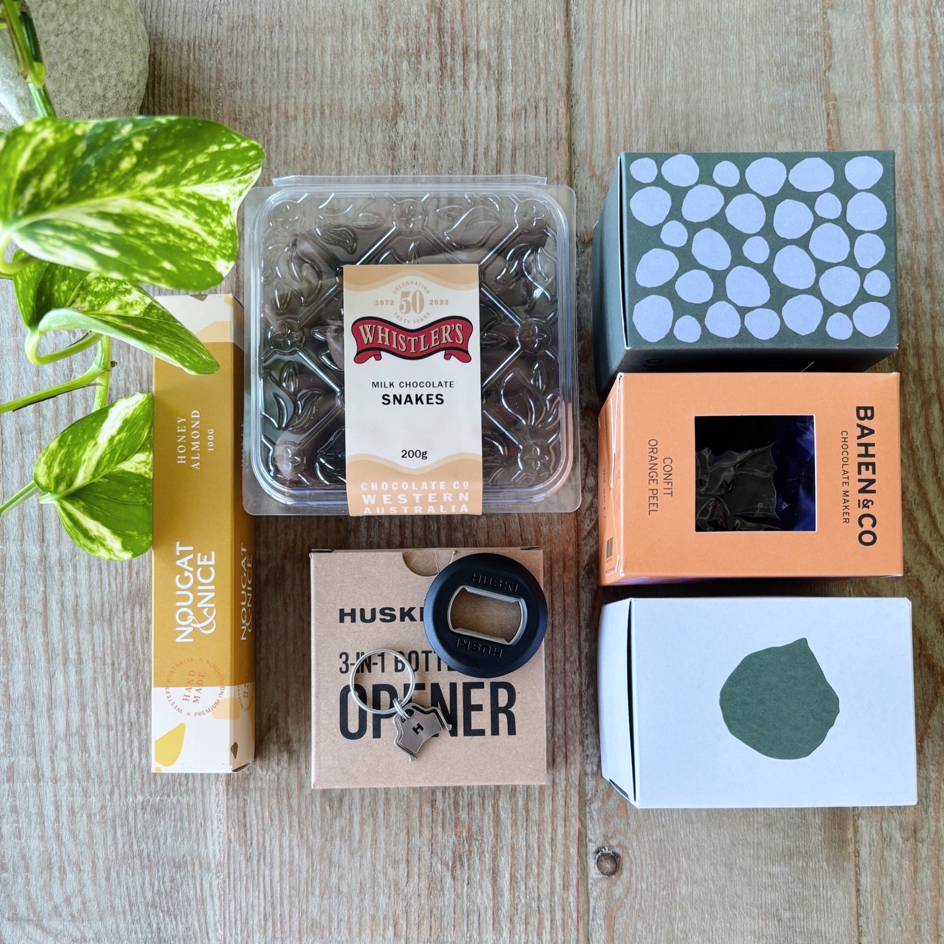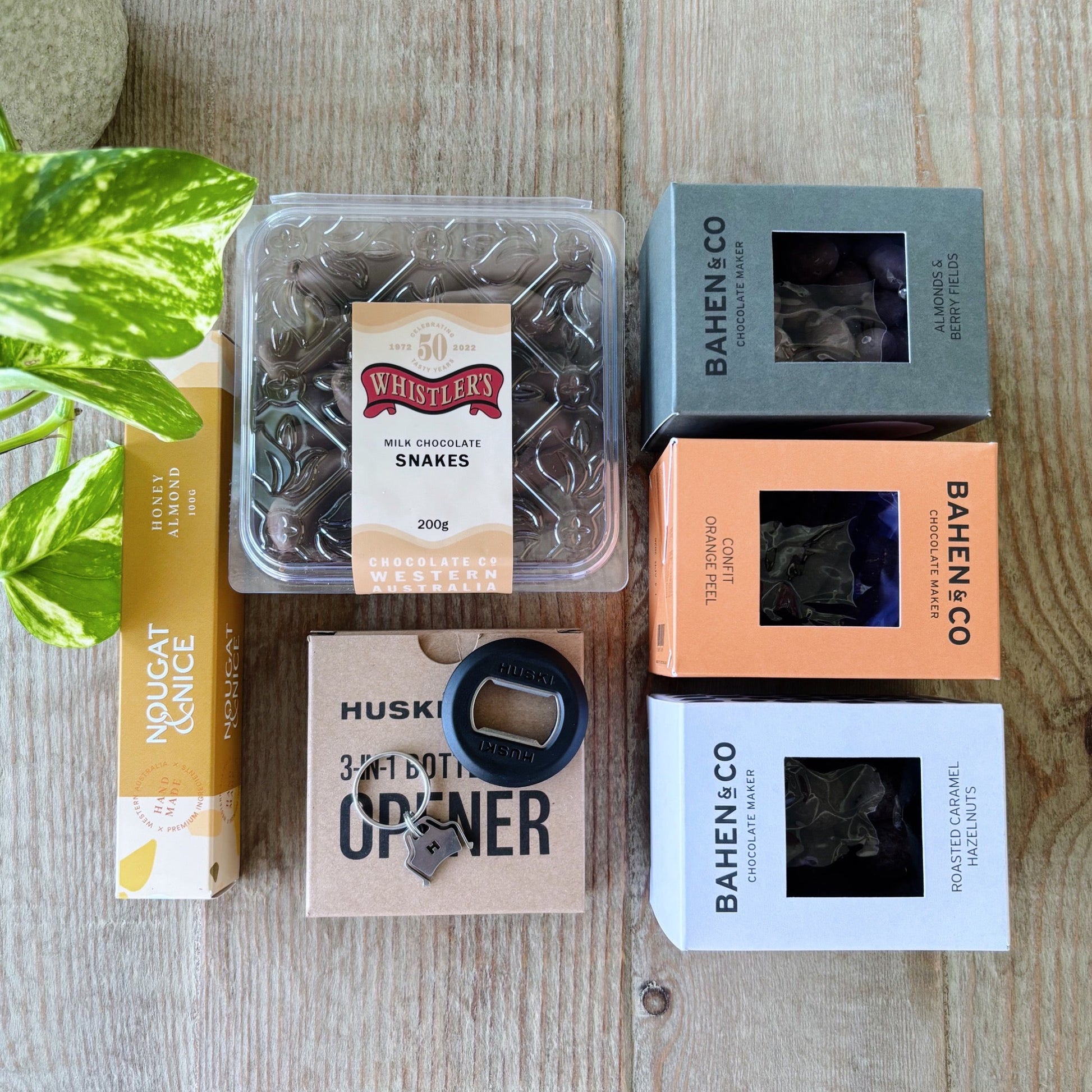 Perfect for snack loving Dads or mates - a 3-in-1 bottle opener, gourmet chocolates, and nougat make this hamper a winner every time.